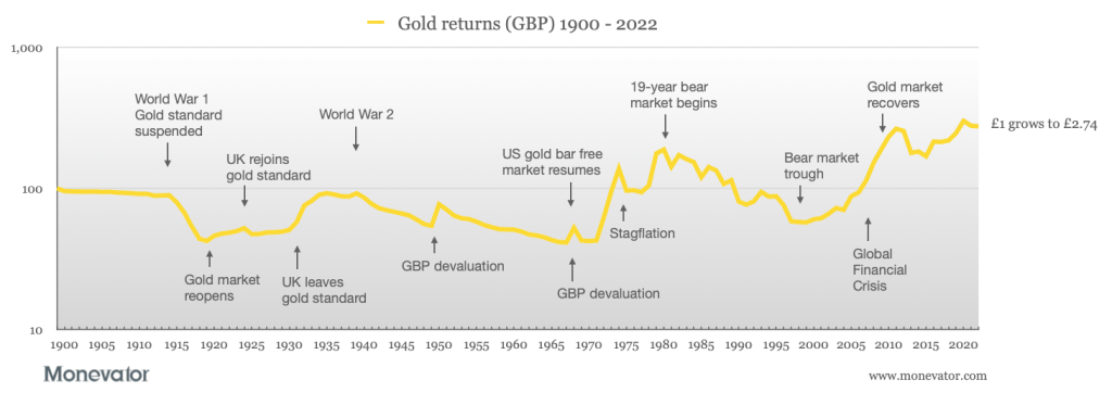 The chart below shows the growth of gold’s investment returns from 1900-2022: