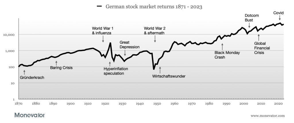 We’ve all heard of the wheelbarrows full of worthless money in Germany back then. In that climate, the stock market was a rare place you could protect your wealth – at least for a time.