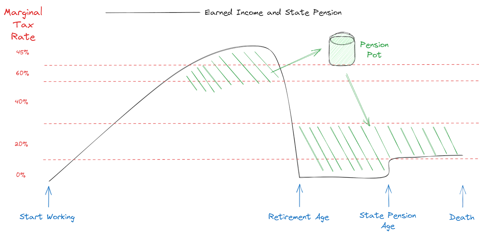 Work out your marginal tax rate to drawdown money from your pension in retirement as a function of pension pot size.